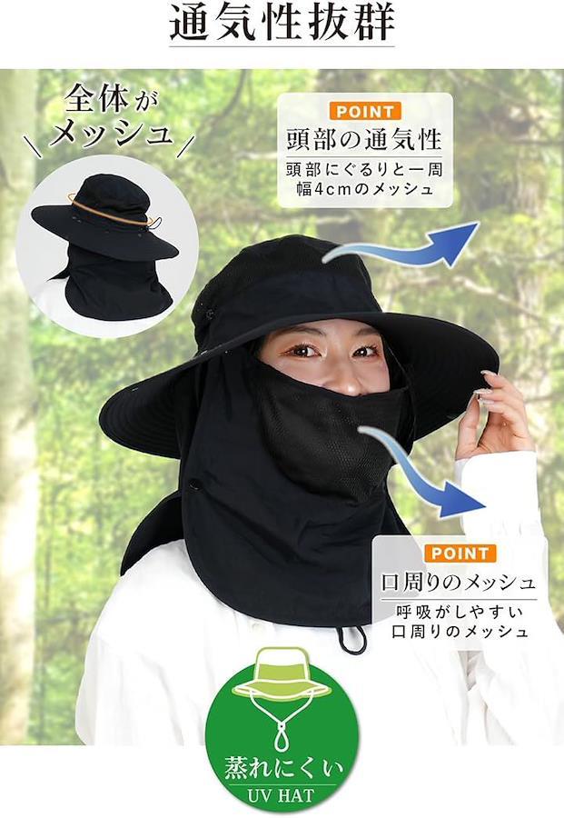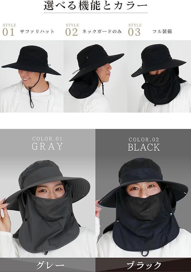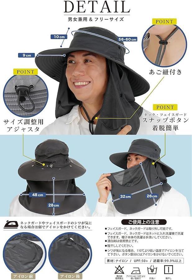 一つあると安心 ・フリーサイズ(サイズ調整用アジャスタ有) ・男女兼用 UNISEX ジェンダーレスデザイン ・UPF50+、遮光100%で強い日差しもカット ・熱中症対策、日焼け防止、虫よけ、花粉対策に ・ネックガードとフェイスガードで首から上をしっかりガード。 ・通気性抜群。