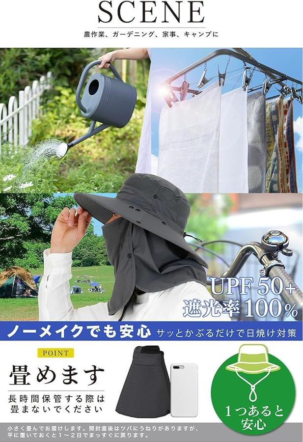 頭だけでなく、顔も首の後ろもしっかりガード。顔や首を守るネックガードとフェイスガード付き ・農作業、ガーデニングなど長時間の屋外作業から、水やり、洗濯物を干すなど短時間の家事まで、すべての屋外作業におすすめする機能的な日除け帽子 ・キャンプなどのアウトドアにもおすすめ。