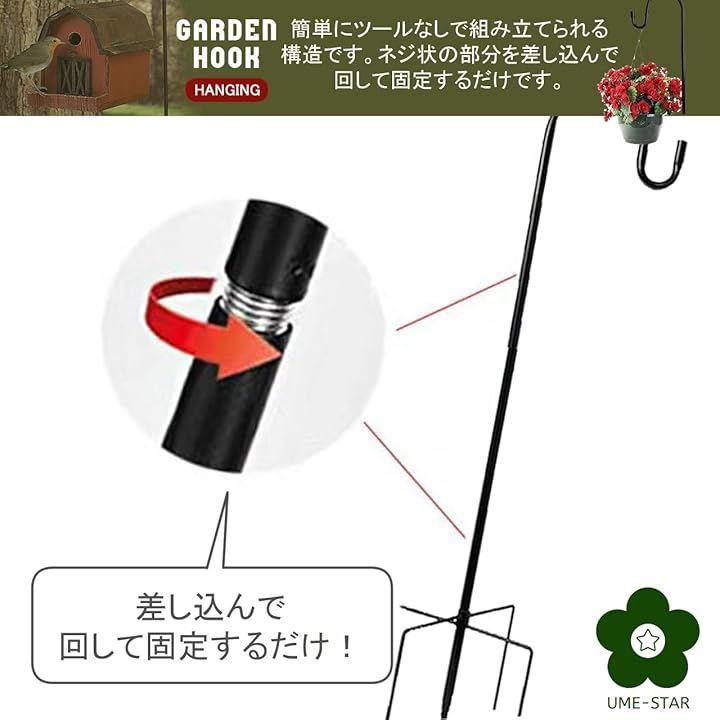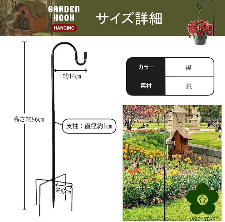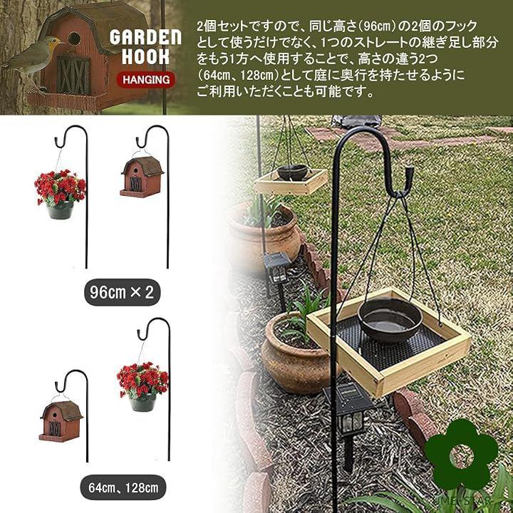 2個セットですので、同じ高さ(96cm)の2個のフックとして使うだけでなく、1つのストレートの継ぎ足し部分をもう1方へ使用することで、 高さの違う2つ(64cm、128cm)として庭に奥行を持たせるようにご利用いただくことも可能です。