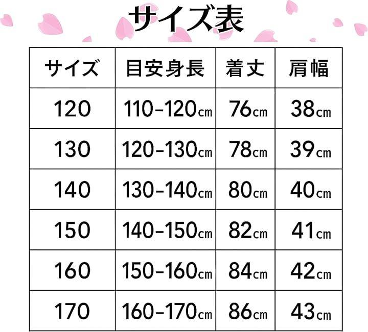 サイズ:120サイズ着丈:76cm肩幅:38cm 130サイズ着丈:78cm肩幅:39cm 140サイズ 着丈:80cm肩幅:40cm 150サイズ 着丈:82cm肩幅:41cm 160サイズ 着丈:84cm肩幅:42cm 170サイズ 着丈:86cm肩幅:43cm