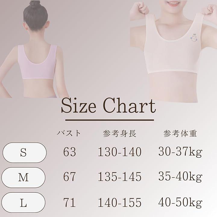 Lサイズ:バスト71cm、身長140-155cm、体重40-50kg