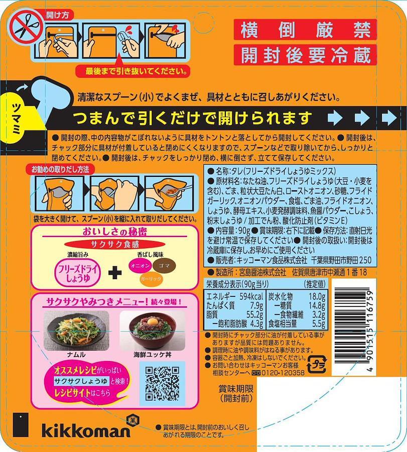 「キッコーマン サクサクしょうゆ」は、フリーズドライしょうゆ、フライドガーリック、フライドオニオンな どを合わせたサクサクとした新食感の「食べるしょうゆ」です。 オイルに漬け込むことで、フリーズドライしょうゆのサクサク食感が保たれ、カリカリに揚げたフライドガーリ ック、フライドオニオン、ごまなどと合わさって凝縮された旨みと香ばしさをお楽しみいただけます。 白いご飯にのせたり、ドレッシングの代わりとしてサラダやゆで野菜にかけたりするだけで、くせになる味わい になります。 海鮮ユッケ、ナムルなどのあえものや炒め物、パスタやチャーハンなど、様々な料理の味付けが手軽に決まりま す。 保存に便利なチャック付パウチを使用しています。