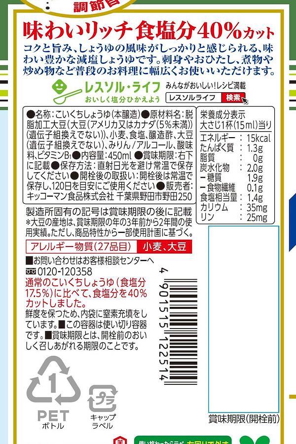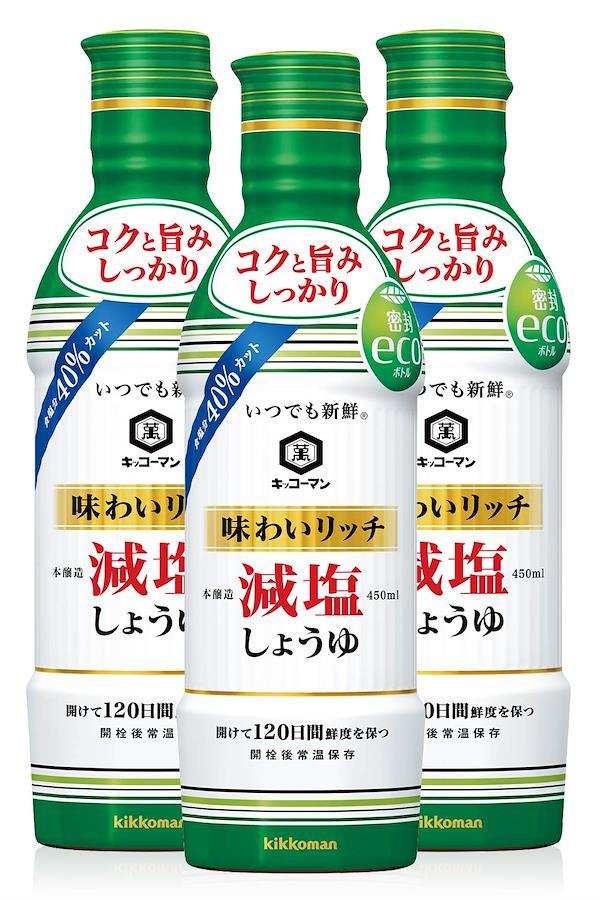 風味豊かに仕上げた、まろやかな味わいの減塩しょうゆです。しょうゆの鮮度を保つ機能はそのままに、パウチ容器から使いやすさを進化させた、二重構造の「やわらか密封ボトル」を採用しています。ボトルを押すとしょうゆが出て、戻すと止まる「押し出し式」なので、一滴から欲しい分まで、自在に調節できます。
