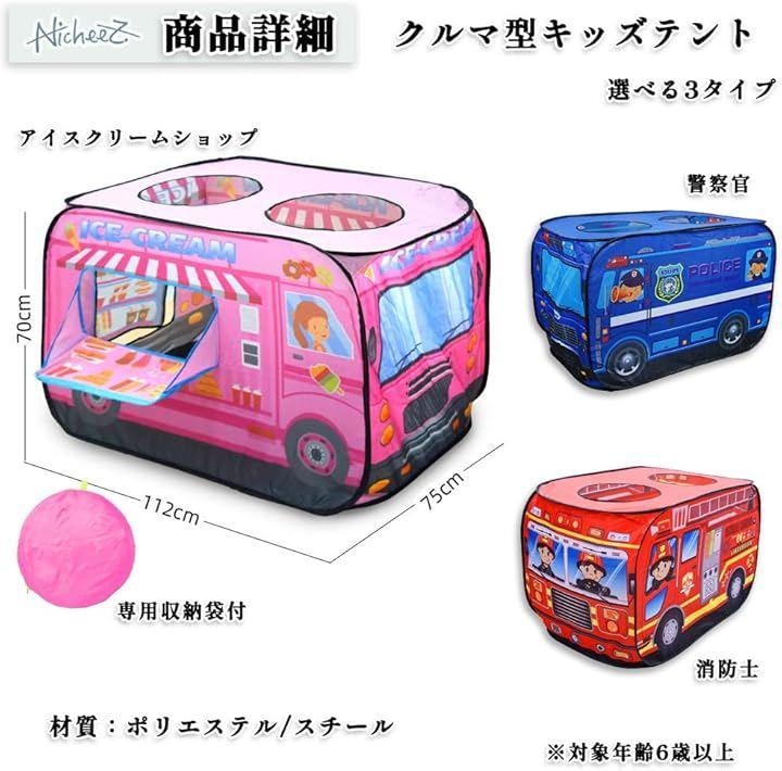 「商品内容」 クルマ型キッズテント 材質:ポリエステル/スチール サイズ:縦/約75cm 横/約112cm 高さ/約70cm タイプ:警察官/消防士/アイスクリームショップ 収納袋付き *対象年齢6歳以上