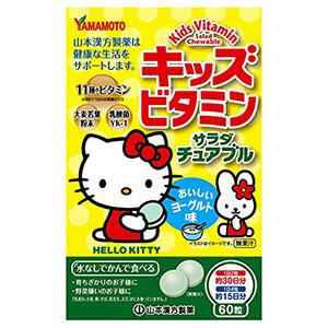 1種のビタミン、大麦若葉、乳酸菌を配合したチュアブルビタミン(子供用サプリメント)です。お子さまが召し上がりやすいおいしいヨーグルト味。キティちゃんのイラストでお子さまに親しみやすいデザインになっています。おいしく食べてお子さまの健康にお役立てください。