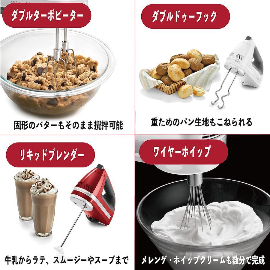 メレンゲやスポンジ生地はもちろん、付属のアクセサリでスムージーやミルクの泡立て、パンやピザ生地もこねることができます。