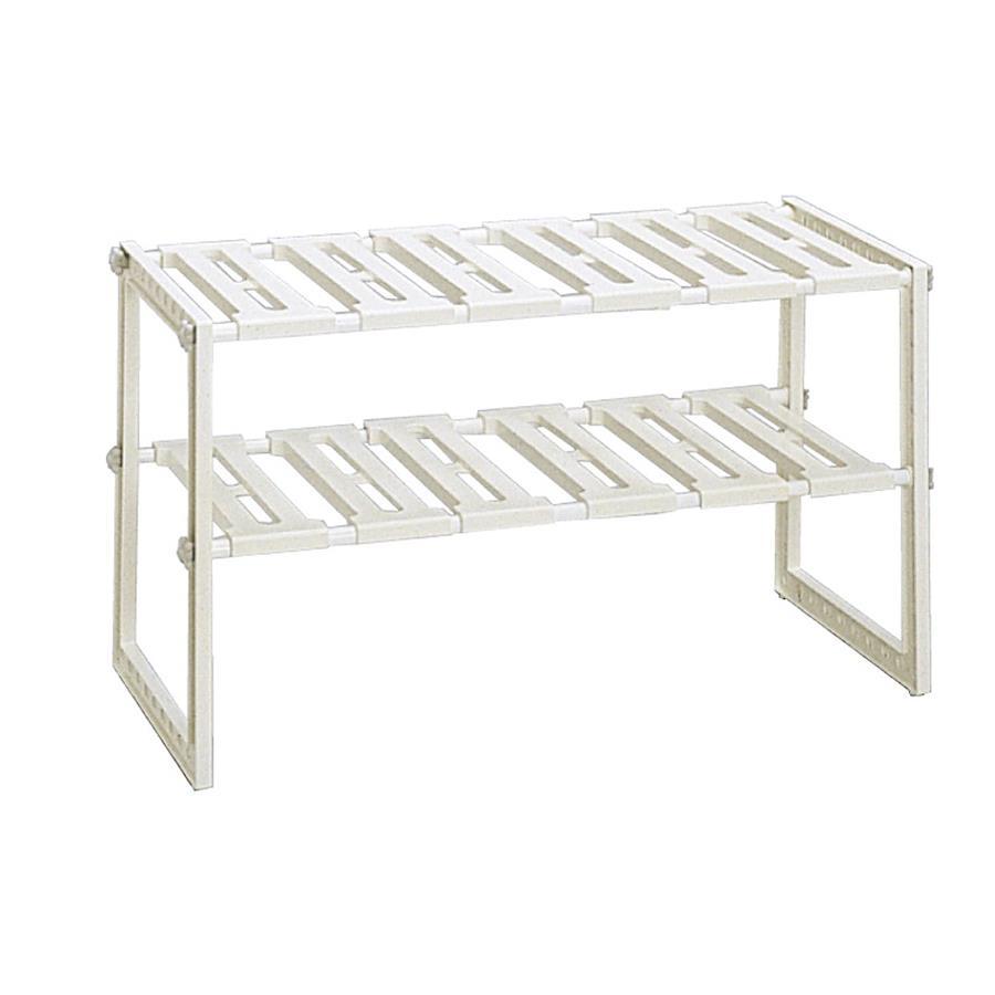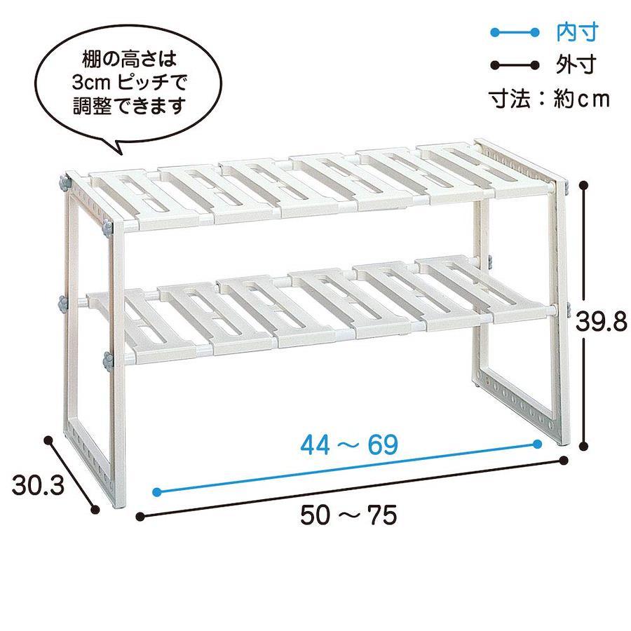シンク下のサイズに合わせて幅50~75cmの間で伸縮することができ、棚の高さも3cm間隔でスペースに合わせて調節できます。
