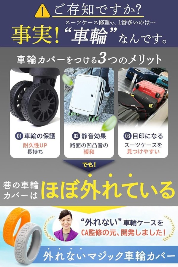 「車輪を保護」車輪を保護することでキャリーケースをより長く愛用することが可能。