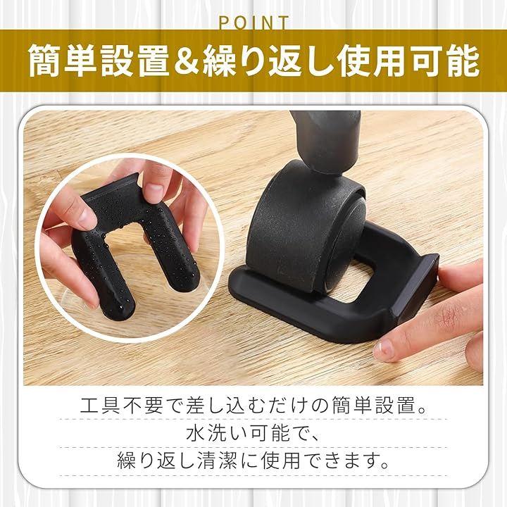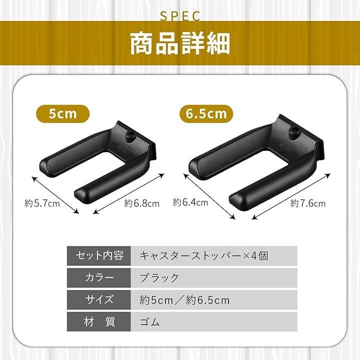 「商品詳細」セット内容:キャスターストッパーx4個 カラー:ブラック サイズ:約5cm/約6.5cm 材質:ゴム *モニターの環境により、色の見え方に若干差が生じる場合がございます。