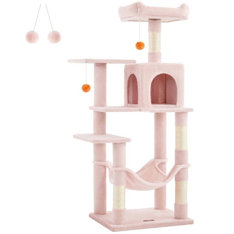 高さ143cmで見晴らしを楽しめるのはもちろん、猫ハウス(隠れ家)・ゆらゆらハンモック・ふかふかベッド2つ・爪とぎポール・ポンポンおもちゃまで搭載した、くつろぎ&運動のオールインワンキャットタワーです。