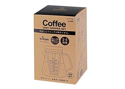 水出しとドリップが両方できる。電子レンジ・食器洗い乾燥機OK。2WAYドリッパー。ドリップはもちろん、水出しコーヒーもペーパーフィルターなしで繰り返し使用できます。2~5杯用。落としても割れにくい丈夫な素材。高い安全性。哺乳瓶にも使用される「トライトン」樹脂。注ぎやすく、液垂れしにくい理想的な注ぎ口。お手入れ楽々。口が広くて洗いやすい。持ち手と本体が一体なのですき間がなく汚れが溜まりません。計量スプーン付き。すり切り1杯約10g(コーヒー豆)持ち運びに便利な収納袋付き。