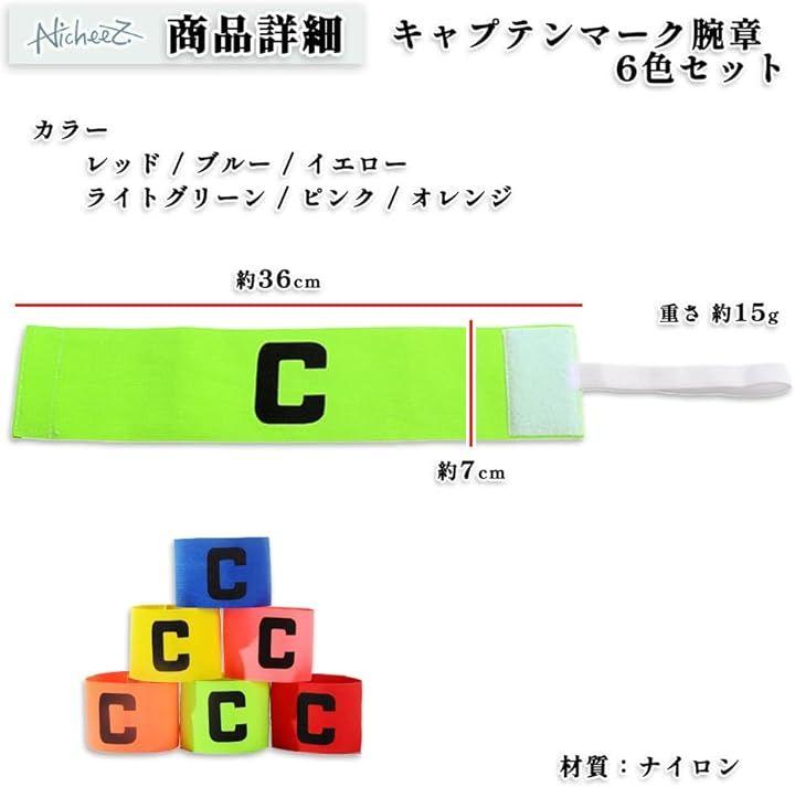 「商品内容」キャプテンマーク腕章6色セット 材質:ナイロン カラー:レッド/ブルー/イエロー/ライトグリーン/ピンク/オレンジ サイズ:長さ/約36cm 幅/約7cm 重量/約15g