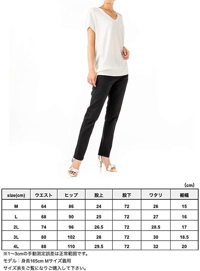 ・「サイズ」[Mサイズ] ウエスト:64cm、ヒップ:86cm、股上:24cm、股下:72cm、ワタリ:26cm、裾幅:15cm [Lサイズ] ウエスト:68cm、ヒップ:90cm、股上:25cm、股下:72cm、ワタリ:27cm、裾幅:16cm [LLサイズ] ウエスト:74cm、ヒップ:96cm、股上:26.5cm、股下:72cm、ワタリ:28.5cm、裾幅:17cm [3Lサイズ] ウエスト:80cm、ヒップ:102cm、股上:28cm、股下:72cm、ワタリ:30cm、裾幅:18.5cm [4Lサイズ] ウエスト:88cm、ヒップ:110cm、股上:29.5cm、股下:72cm、ワタリ:32cm、裾幅:20cm