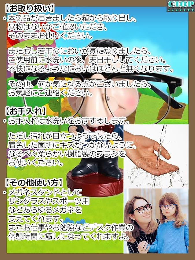 「取り扱い」:本製品が届きましたら箱から取り出し、異物はないかご確認いただき、メガネをセットしお使いください。