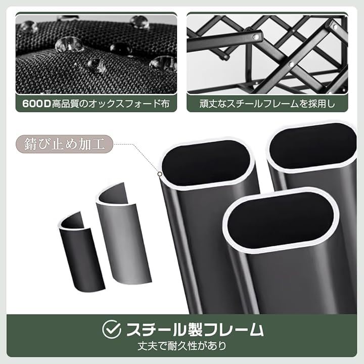 「丈夫な素材」600Dオックスフォード生地を使用しており、雨や泥にも強く、防汚性能が高く破れにくい、長時間の使用に耐えられます。