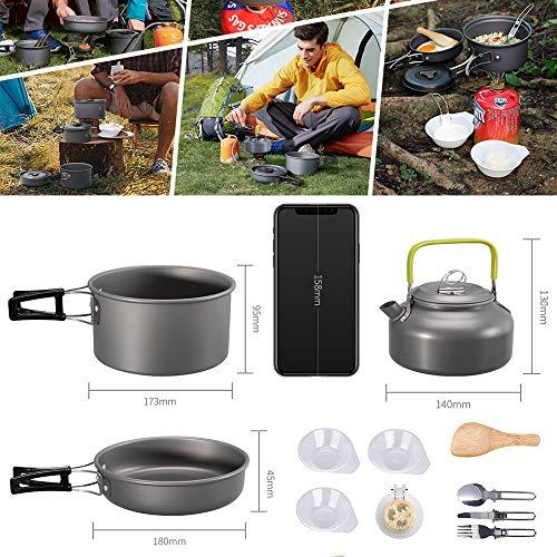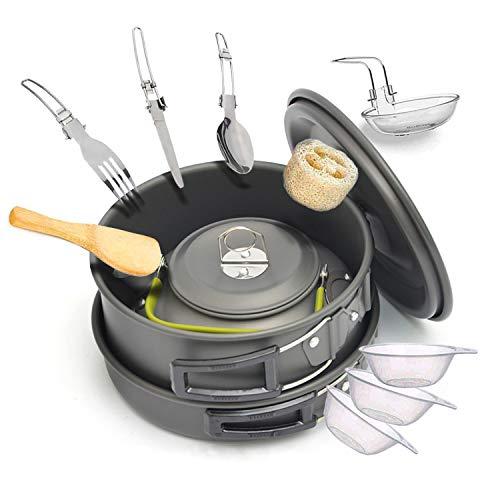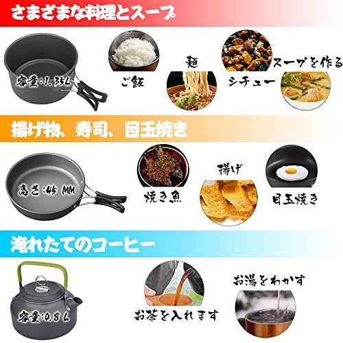 【携?便利】:クッカーセットは折りたたみ式ハンドルを採用します。ハンドル折畳して16点を一括収納。持ち運びにとても便利で、メッシュバッグであらゆる問題を解決!バックパックに掛けるだけ。【商品詳細】材質:アルミ。 重量:900g 。セット内容: 165 * 90mm鍋* 1、170 * 45mmフライパン* 1、0.8Lやかん* 1、おわん* 3、スープレードル*1、しゃもじ*1、ステンレス食器セット*1,ヘチマ食器洗いブラシ×1、収納メッシュバッグ×1。【調理性能】:キャンプポットは、800 mlの水をわずか2分30秒で沸かすことができ(待機中に食材を準備したり、半分の曲を聴いたりできます) クッカーは熱が伝わらない熱絶縁プラスチックのハンドルを採用しており、やけどを防止。また滑り止め防止加工も施されており安全に料理をお楽しみいただけます。【食品グレードの素材】 FDA承認の無毒の陽極酸化アルミニウムで作られた軽量の高温調理鍋。陽極酸化処理により、アルミニウムの金属表面には、強力で耐久性があり、軽量で熱伝導性のある安定した保護層があります。時間と燃料を節約できるだけでなく、掃除も簡単です。【優秀なプレゼント】:ハイキングやキャンプの世界で高品質で高価値の製品を見つけたい人向け。キャンプが大好きな愛する人に贈ることもできます。朝食、ランチ、ディナーを友達と作ったり、ハイキングをしたり、ロマンチックなピクニックや一晩を過ごすのに最適です。