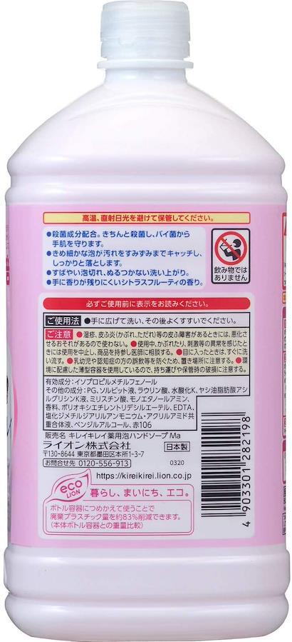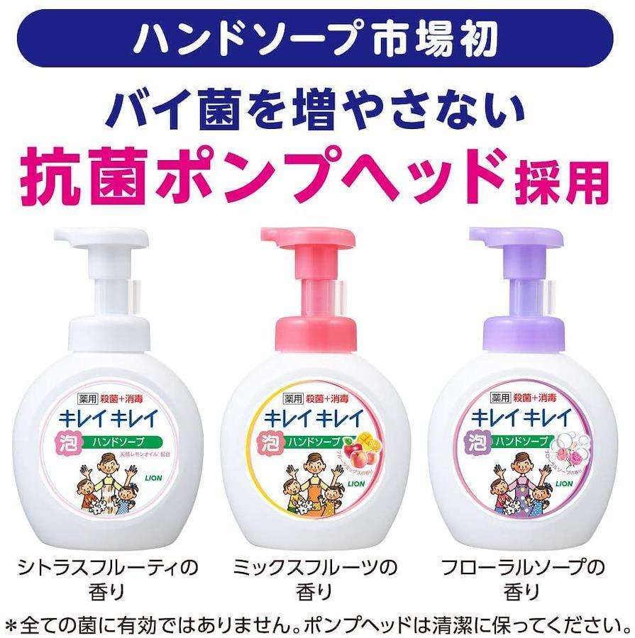 〇商品説明きちんと殺菌し、バイ菌から手肌を守るキレイキレイ薬用泡ハンドソープ●片手で持ててつめかえやすく、たっぷり使える。●きちんと殺菌し、バイ菌から手肌を守ります。●きめ細かな泡が汚れをすみずみまでキャッチし、しっかりと落とします。●すばやい泡切れ、ぬるつかない洗い上がり。手に香りが残りにくいシトラスフルーティの香り