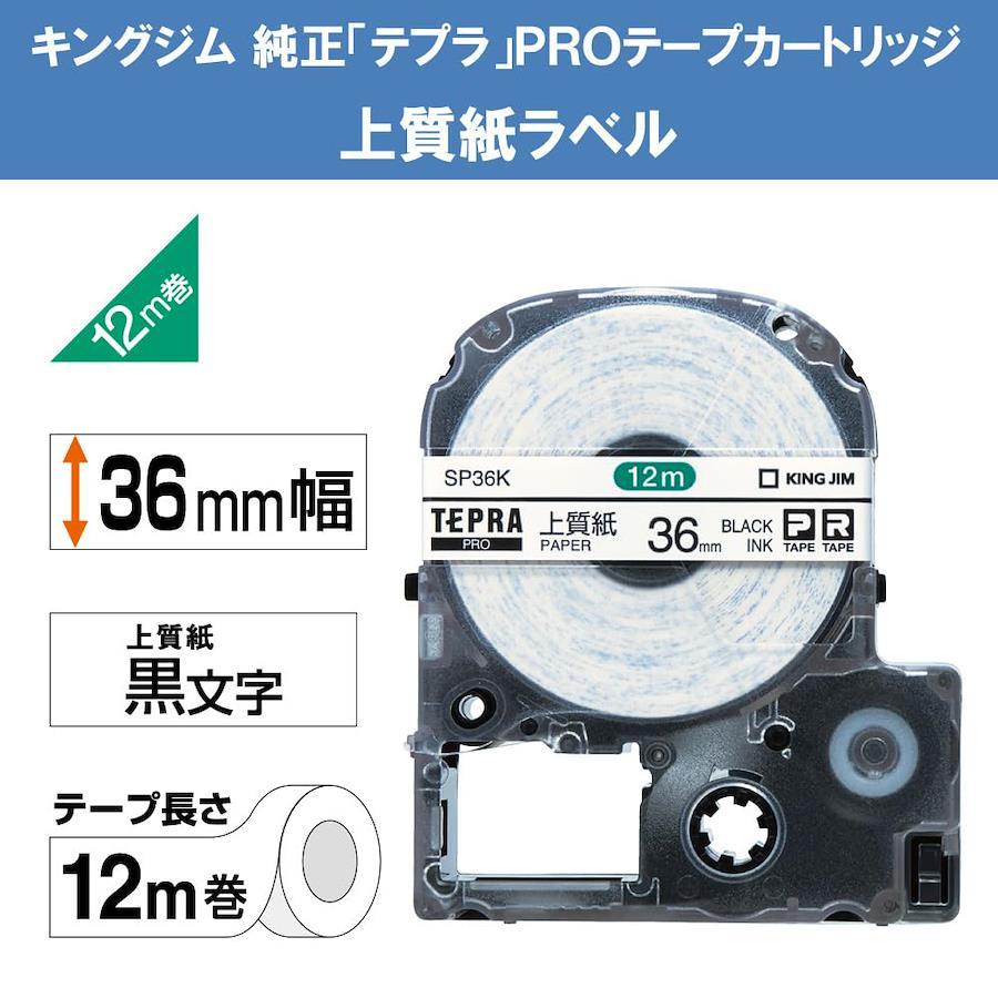 「テプラ」PROシリーズ専用テープ「 テープカートリッジ テプラPRO 上質紙 36mm SP36K 白」。36mm幅で葉書や封筒の宛名ラなどに適しています。白地に黒文字で印字される上質紙ラベルになります。