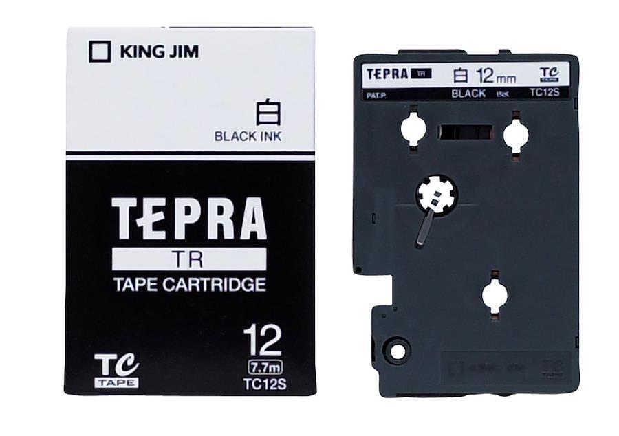 オフィスで大活躍。ポピュラーな白ラベル。「テプラ」TRシリーズ専用テープ。12mm幅でファイルの背見出しなどに適している。白地に黒文字で印字。