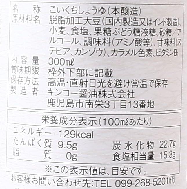 原材料: 糖類(果糖ぶどう糖液糖、砂糖)、脱脂加工大豆、小麦、食塩、アルコール、調味料(アミノ酸等)、甘味料(ステビア、カンゾウ)、カラメル色素、ビタミンB1