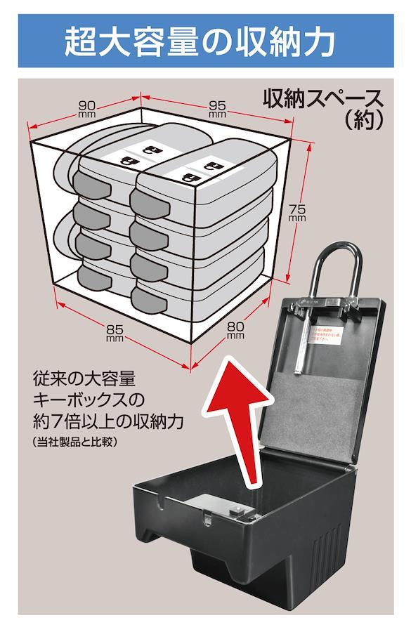 リモコンキーが複数入る、超大型のキーボックスです。従来の大容量キーボックスの約7倍の収納力。(ノムラテック製品と比較)大型キー・カードキー、形を気にせず収納可能、鍵をとにかくたくさん収納したい時に最適です。大型の自動車キーやカードキー、種類によっては複数の鍵を一度に収納可能です。施錠・解錠はダイヤル式でキーは不要!ダイヤルを上向きに回すと「0」の位置で止まりますので、夜間など番号が確認しにくい場合でもダイヤルが合わせやすくなっております。暗証番号は可変式で自分の好きな番号にセット出来ます。レバーハンドルアダプター付。伝言メモ紙等収納物の一時保管・受け渡しに!(防水加工はしておりません。超大容量。鍵の収納BOX。 本体サイズ9.5×20.4×9