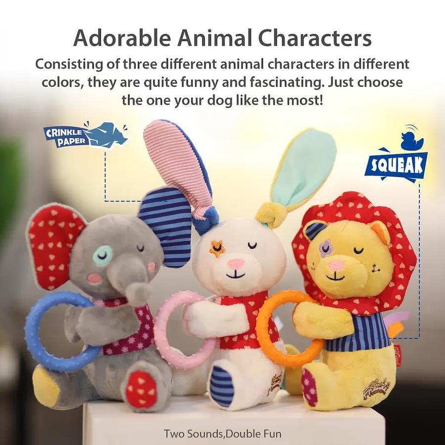 ●つねに愛犬のそばに寄り添う、寝顔の可愛い仲間たち。●もちもちとした手触りのぬいぐるみボディには、噛みごこちの違いが楽しめるリングがついています。●中綿なしの耳部分にはカシャカシャ音が楽しいクリンクル、背中にはくわえやすいタグも付いておりパピーからシニアまで楽しめます。