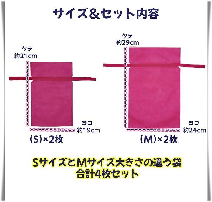 サイズ/セット内容 Sサイズ小袋/タテ約21cmヨコ約19cm Mサイズ中袋/タテ約29cmヨコ約24cm 不織布素材ダブルリボン付き Sサイズ小袋2枚+Mサイズ中袋2枚 合計4枚