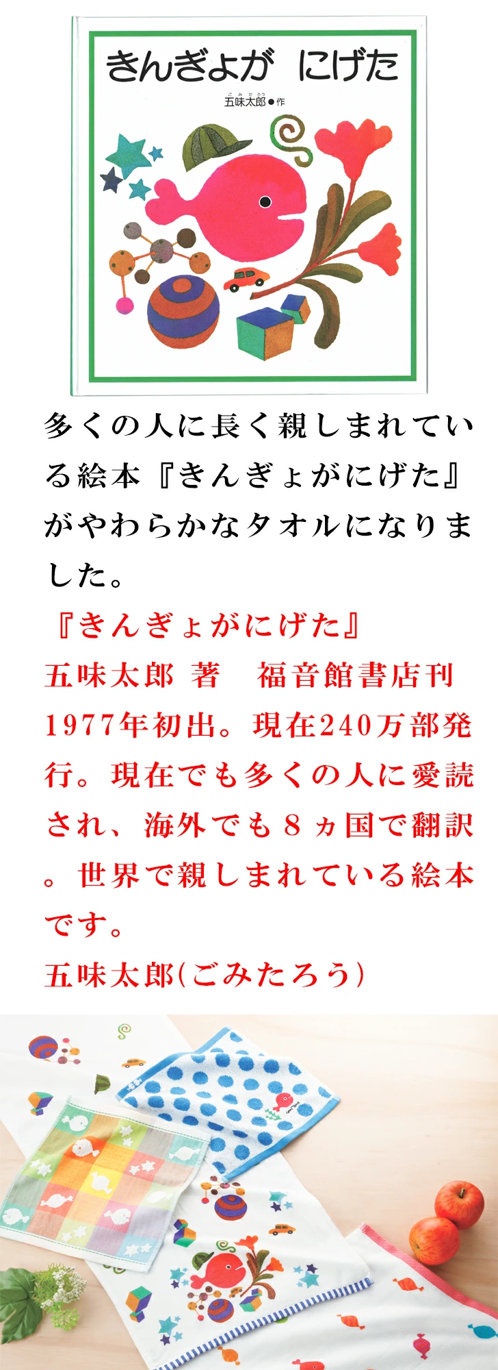 多くの人に長く親しまれている絵本『きんぎょがにげた』がやわらかなタオルになりました。