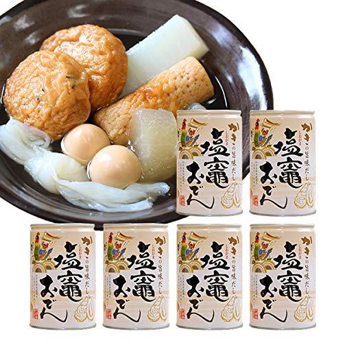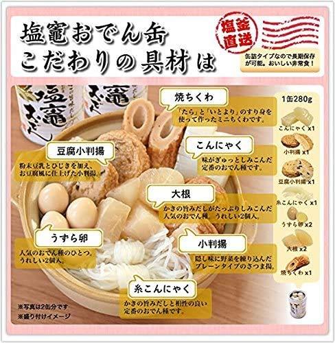 おでん 缶詰 カキ ダシ 塩釜 阿部善 おつまみ 土産 三陸 練り物【1缶あたり】 規格280g 商品サイズ7号缶(内径65.4mm、高さ101.1mm) 外箱外寸205 × 275 × 1120 mm ※賞味期限が2年以上3年未満の商品をお届けいたします。【1缶あたり】 エネルギー122kcal たんぱく質9.2g 脂質4.5g 炭水化物11.2g ナトリウム1260mg食塩相当量3.2g 小麦 卵 大豆 使用塩竈おでんの最大の特徴は、「かきの旨みだしスープ」です。塩竈の浦戸諸島や日本三景松島の名産である「牡蠣」の旨みにヒントを得て、牡蠣のエキスを使った上品な味わいに仕上げました。具材には、塩竈の練り物を始め、大根・うずらの卵・こんにゃくなど人気のおでん種7種類を選定。あっさりと透き通ったスープとおでん種の相性は抜群です。常温保存なので非常時の備蓄としてはもちろん、贈り物にも大変喜ばれる商品です。