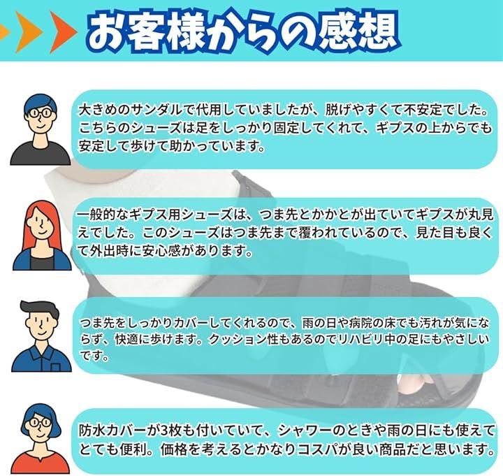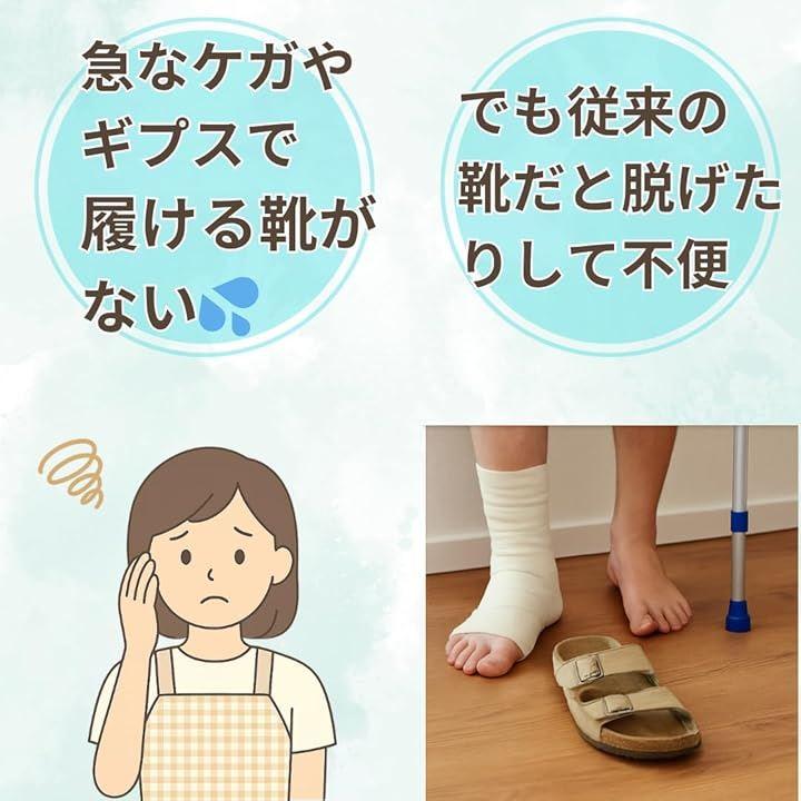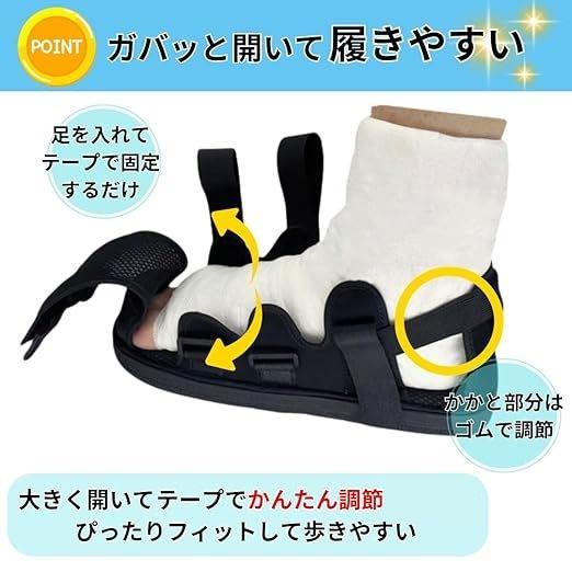 ギプスや包帯を巻いた足でも安全に歩行できる、つま先までしっかりカバーされたギプスシューズです。