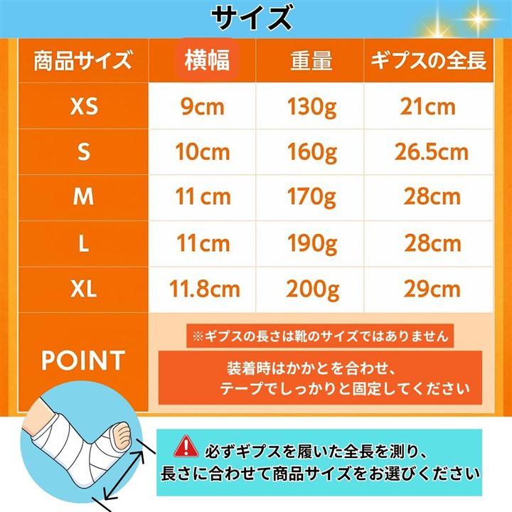 | サイズ | シューズ全長 | 適応目安 | S | 25.0cm | 小さめのギプス向け | M | 26.5cm | 標準的なギプスサイズ | L | 28.0cm | やや大きめのギプス向け | XL | 29.0cm | 大きめ・厚手のギプス向け