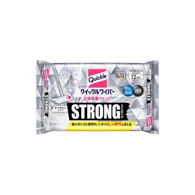 【クイックルワイパー 立体吸着ウエットシート ストロングの商品詳細】●床のベタベタ汚れがゴシゴシしないで拭きとれる強力タイプのウエットシートです。●キッチン床やダイニング床に。●クイックルワイパー専用【使用方法】・クイックルワイパーの柄がゆるんでいないことを確認してください。・袋表面のシールを真横にめくり、シートを1枚取り出してください。・シートの中央部にクイックルワイパーを置いて、ヘッドを包み込むよう、差し込み口(4ヶ所)に押し込んで止めてください。<使用の目安>シート1枚(両面)で約15~20畳<用途>床(フローリング・ビニール)、壁、畳、網戸、玄関たたき※ザラザラした表面の場合はシート成分がしみこんだり、シートのセンイが抜けることがあります。目立たない所で試してからお使いください。<使えないもの>窓、鏡、水ぶきできないもの(水がしみこむ白木・家具・壁材等)、桐、うるし塗り、銅、しんちゅう製品、プラスチック製品、液晶画面、プラズマディスプレイの画面、天然石材【クイックルワイパー 立体吸着ウエットシート ストロングの原材料】シート・・・ポリエステル、レーヨン、アクリル、ポリプロピレン【成分】エタノール、界面活性剤(ソルビタン脂肪酸エステル、ポリオキシエチレンアルキルエーテル、アルキルアミンオキシド)、除菌剤、香料【規格概要】品名:住宅用掃除シート液性:弱アルカリ性大きさ:約205mm*約285mm枚数:12枚入【注意事項】<使用上の注意>・用途外に使わない。・シートは長時間置いておくと、乾燥して洗浄効果がなくなるので、1度袋から出したらすぐに使う。・クイックルワイパーに付けたまま、長時間直接床の上に置いたままにしない。床が変色することがある。・子供の手の届く所や火気の近く、日の当たる所及び高温になる所に置かない。・畳、水がしみ込む家具・壁紙は、目立たない所で、変色しないことを試してから使う。・砂粒や硬いごみが付着したシート面でふくと床を傷つける恐れがある。・使用後は手をよく水で洗う。・荒れ性の方や長時間使用する場合は、炊事用手袋を使う。【発売元、製造元、輸入元又は販売元】花王