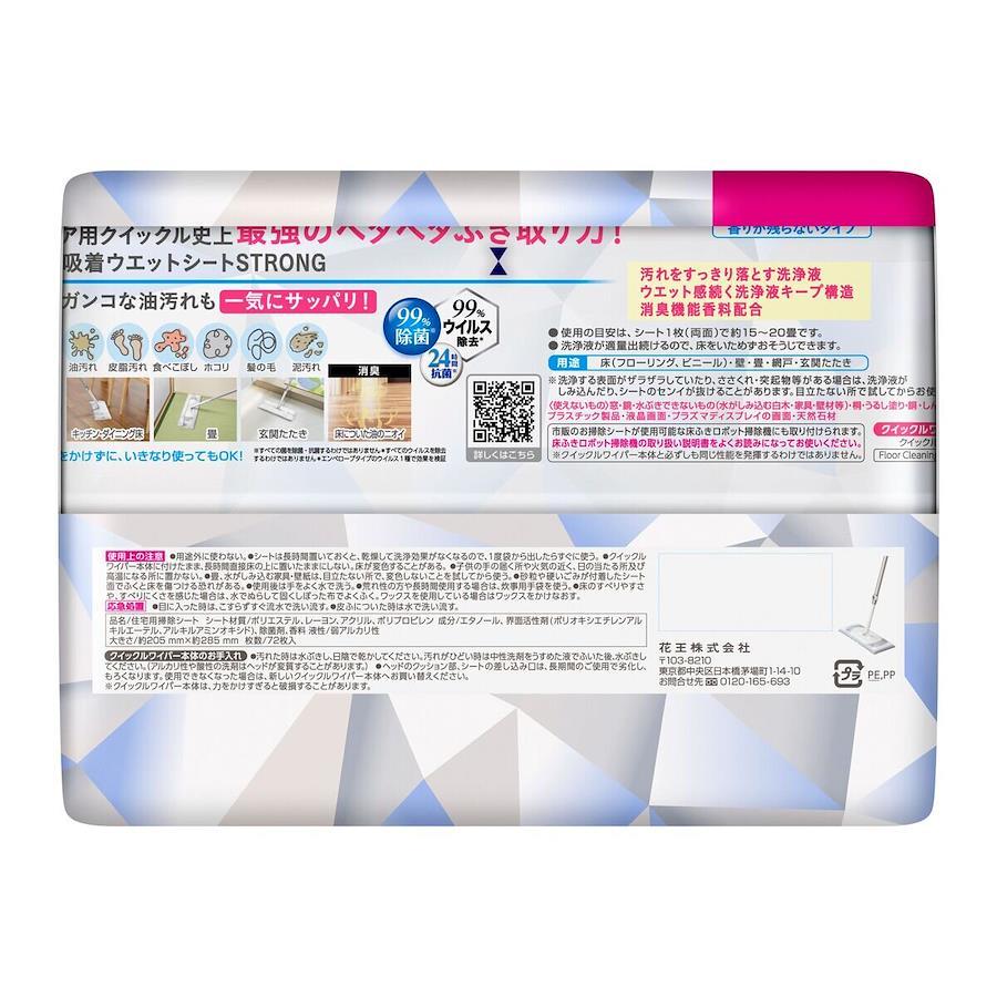 キッチン床の油汚れや、ダイニング床の食べこぼしの汚れをゴシゴシしないで拭きとれる強力タイプのウエットシート。ベタベタ汚れに強い洗浄液採用し、フロア用クイックル史上最強のふき取り力※1。99%除菌※2・99%ウイルス除去※2*・消臭も。※1 当社フロア用ウエットシート調べ※2 すべての菌・ウイルスを除去するわけではありません* エンベロープタイプのウイルス1種で効果を検証