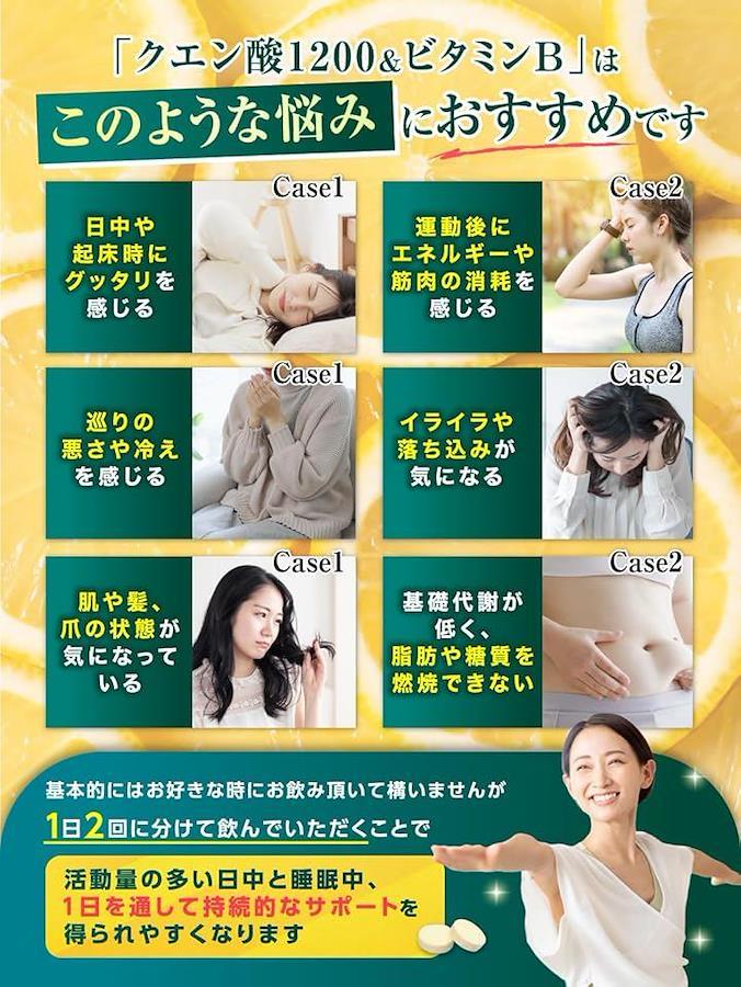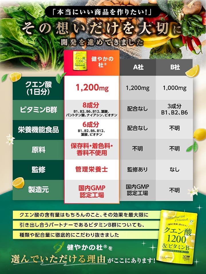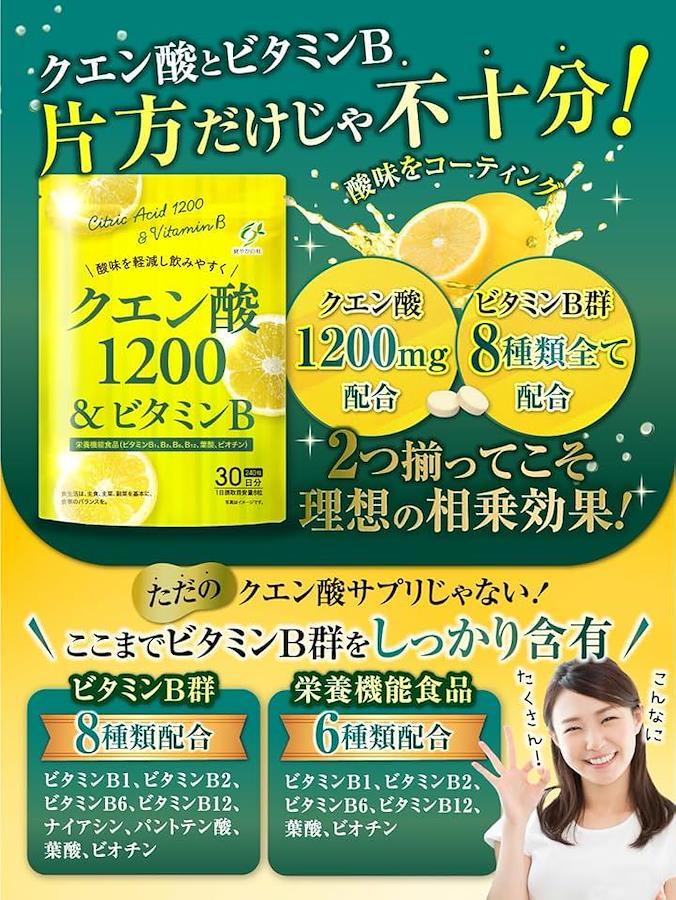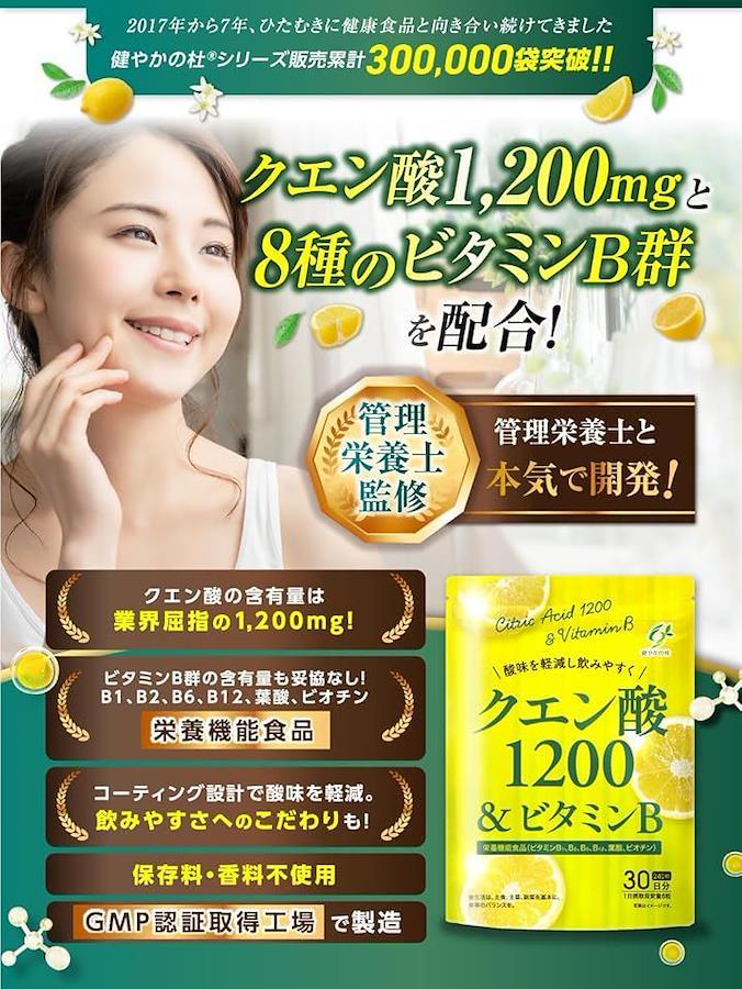 「クエン酸1200mgと8種のビタミンBビタミン群を配合」 ただのクエン酸サプリではありません。クエン酸の含有量は業界屈指の1,200mgに8種類のビタミンB群全てをしっかり配合。その内6種で栄養機能食品の基準を満たしております。