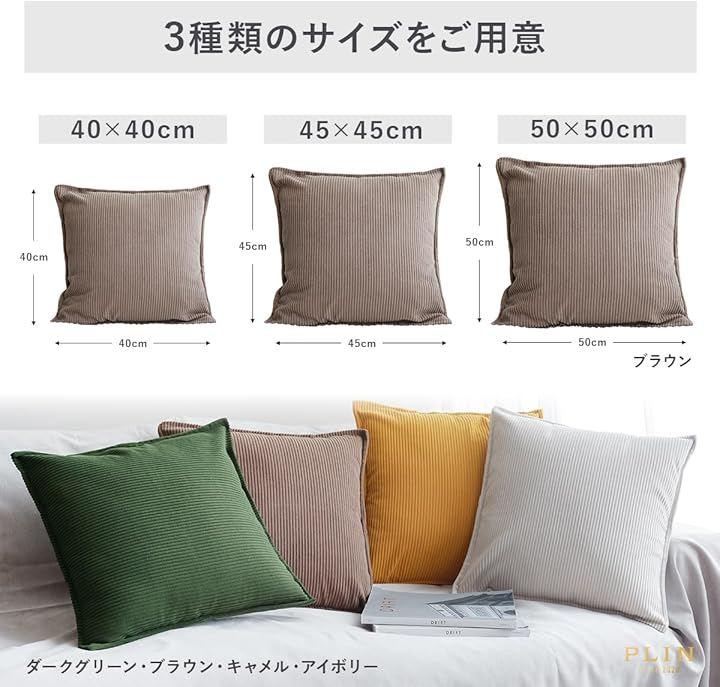 クッションカバーのサイズ 40x40cm、45x45cm、50x50cm サイズは様々なバリエーションがありますが、一般的な規格サイズは45cm x 45cmになります。