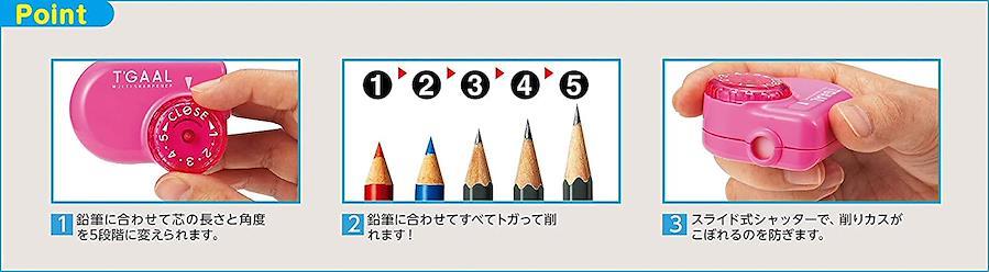 鉛筆に合わせて、削り角度を変えられる鉛筆削り色鉛筆やHB芯など芯の硬さに合わせて使い分けできます!5段階で削れ、どの角度で削っても芯がドガって削れる!スケルトンなので削りカスが一目でわかり捨てるタイミングがわかりやすい!