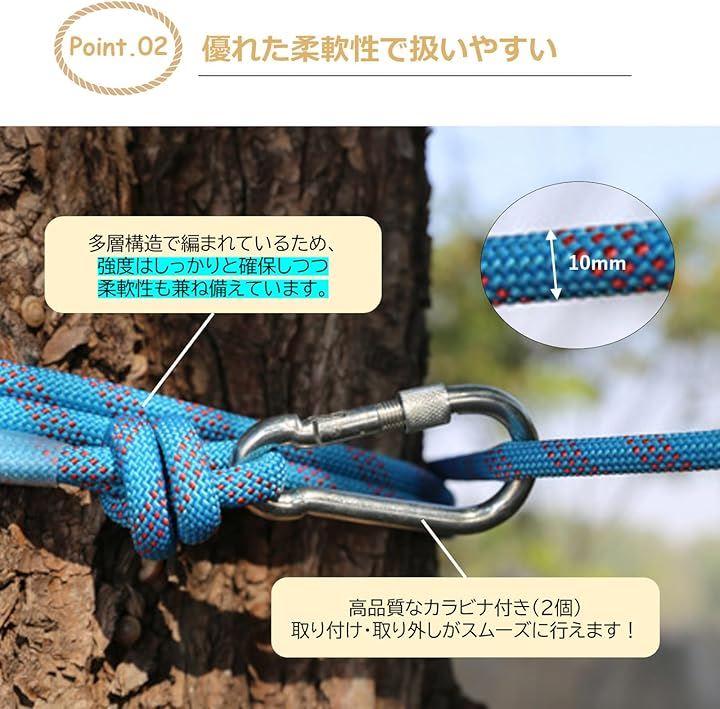 多層構造で編まれているため、強度だけではなく柔軟性もバッチリ。高品質なカラビナが2個ついており、取り付け・取り外しもスムーズに行えます。