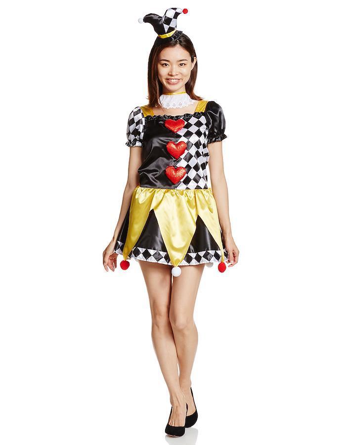 トランプの世界から飛び出してきたようなピエロの大人サイズコスチュームです。ゴールドカラーとハートモチーフがアクセントになっているドレスです! 対応身長155~165cm バスト85~95cm ウエスト64~76cm ※ワンドは含まれておりません。