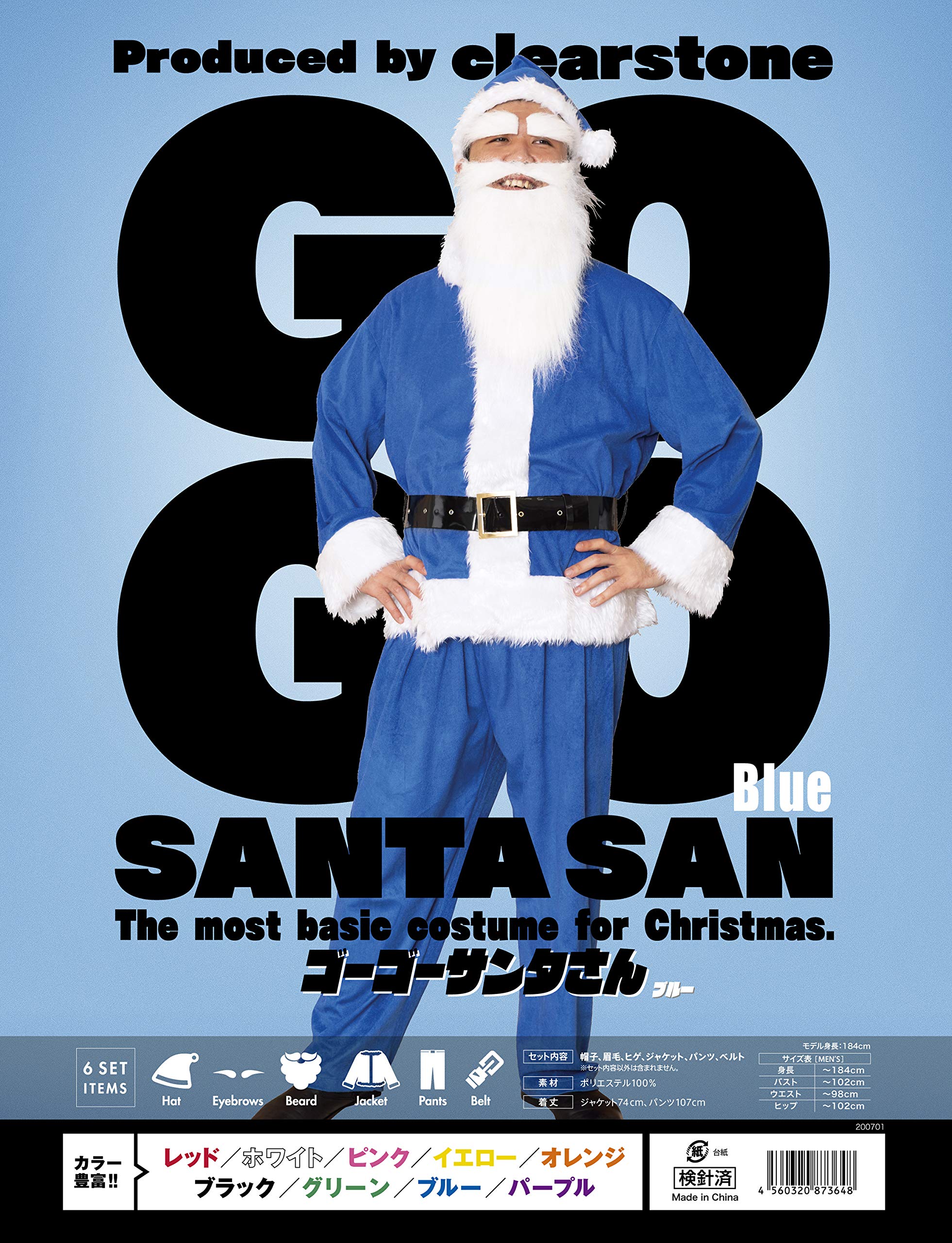 カラバリ豊富! カラフルなメンズサンタシリーズ! 推しメンカラーを選んでライブやイベントに使ってね。なんと付け眉毛やヒゲまでセットの豪華6点セット! グループで着て目立っちゃうのもGOOD。 セット内容:帽子、眉毛、ヒゲ、ジャケット、パンツ、ベルト 洗濯表示:洗濯不可、塩素系漂白剤による漂白不可、アイロンは中温で当て布使用、ドライクリーニング不可 対応サイズ:Men's/身長 ~180cm、B ~102cm、W ~98cm、H ~102cm メイン部分の長さ(着丈等):ジャケット74cm、パンツ107cm 開き:ジャケット/前スナップボタン、パンツ/ウエストゴム