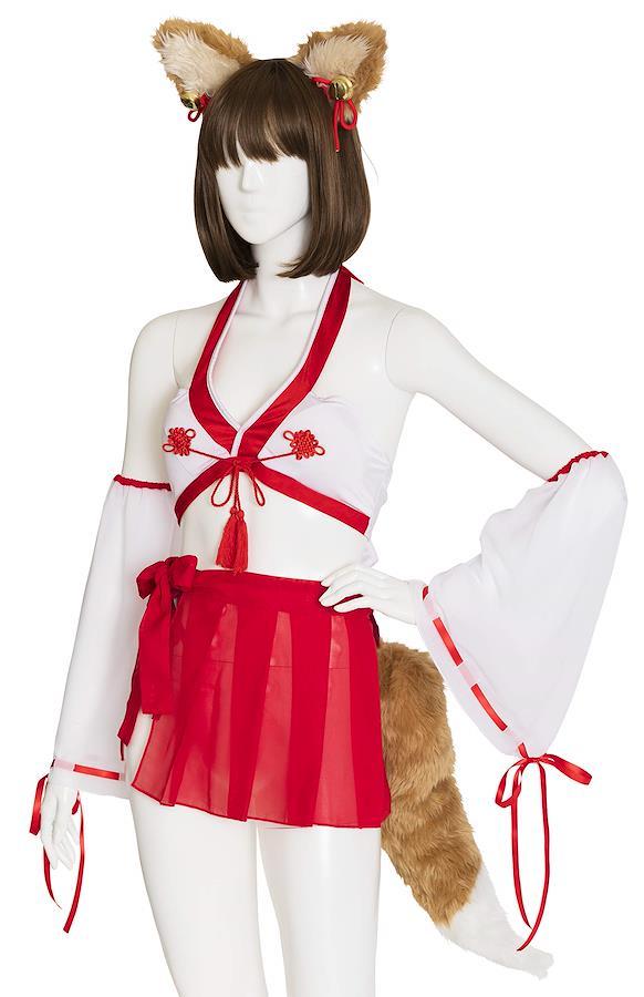 「かわいい×フェティッシュ」がコンセプトの「SugarWhip」シリーズ。撮影会にもおすすめです。小物までこだわった5点セット。大きな狐耳としっぽがセットのきつね巫女衣装。長毛ファーの狐耳は左右好きな位置に動かせます。耳には大きな鈴と紐リボン付きの和風なデザイン。ストレッチ生地が着心地の良いブラジャーはリボンで結ぶタイプなので体型によってサイズ調整可能。胸の谷間が綺麗に見えるシルエットです。付け袖とスカートは透け感のあるシフォン素材。巻きスカートなのでサイドで結んでスリット風にしたり、後ろで結んでしっぽを強調させても可愛いです。全長50cmの大きなしっぽは腰紐で結ぶタイプ。中綿とワイヤー入りでフサフサです。ボリュームたっぷりの小物は単品でも使える優れものです。【推奨サイズ】Ladies:身長155~165cm、B/~90cm、W/~70cm、H/~96cm【注意事項】※生産時期やロット、デザインによって、多少サイズ・色・柄が異なる場合があります。摩擦や水濡れにより色移りする恐れがありますのでご注意ください。※商品画像は可能な限り実物の色に近づくよう調整しておりますが、お使いのモニター設定、お部屋の照明等により実際の商品と色味が異なって見える場合がございます。又、同じ商品の画像でも、撮影環境によって画像の色に差異が生じる場合がございます。【洗濯表示】洗濯不可、塩素系漂白剤による漂白不可、アイロンは中温で当て布使用、ドライクリーニング不可※洗濯はお避け下さい。汚れは水で薄めた中性洗剤でタオル等を使って拭き取って下さい。アイロンは、当て布使用して下さい。【製造元】株式会社クリアストーン(#lf)(#lf)(#lf)商品購入前に、ストア紹介ページをご確認ください。