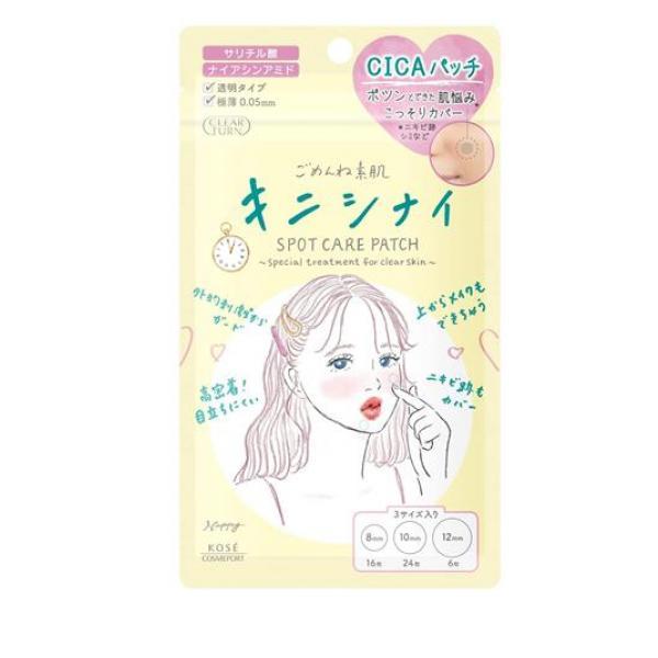 製品の特徴●CLEAR TURN ごめんね素肌 キニシナイパッチ●トラブルスポット(*1)をこっそりカバー。0.05mm超極薄CICAパッチ。●気になるトラブルスポット(*1)を集中ケアしながら、外的刺激(*2)からガード。●とても薄いので、目立ちにくく、上からメイクもできます。密着力も高く、寝ている間も剥がれにくい。●無鉱物油・オイルフリー・パラベンフリー・シリコーンフリーでやさしい使い心地。●大(12mm/6枚)・中(10mm/24枚)・小(8mm/16枚)3サイズのパッチが入っているため、貼りたい部分に合わせて選べます。●透明タイプで水にも強い。●人気イラストレーターNAPPYさんコラボデザイン。●販売名:CT BS スポットケアパッチ〈パック〉