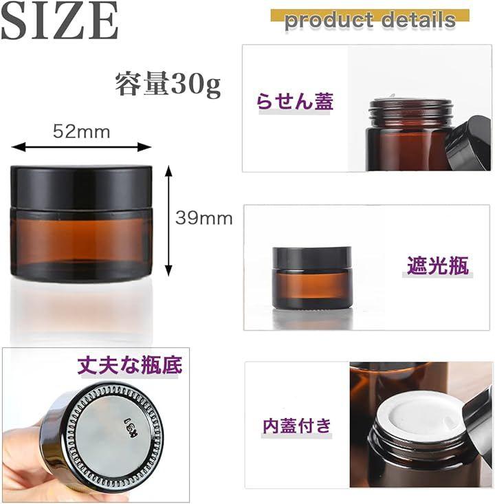 「商品内容」本体:20個入 容量:30g サイズ:直径52mm、高さ39mm カラー:ブラウン 材質:ガラス、ABS 付属:ハンドプル付きガスケット(中蓋) *自社にて検品はしっかり行なっておりますが、どうしても製造上の都合で外蓋に小傷等ができてしまう場合がございます。
