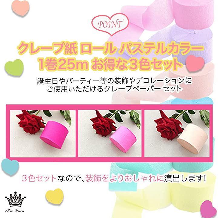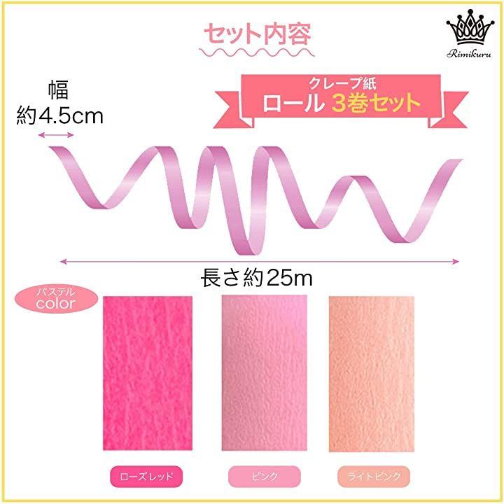 ・「商品仕様」セット内容:クレープ紙 ロール 3巻セット サイズ:幅 約4.5cm x 長さ 約25m カラー:(パステル)ローズレッド・ピンク・ライトピンク *モニターの環境等により、色の見え方に若干差が生じる場合がございます。