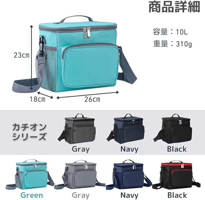 「商品詳細」容量:10L サイズ:長さ26cm x 奥行18cm x 高さ23cm 重量:310g 素材:[外側]オックスフォード生地、[内側]EVA(エチレン酢酸ビニル) カラー:ブラック/グレー/ネイビー/グリーン