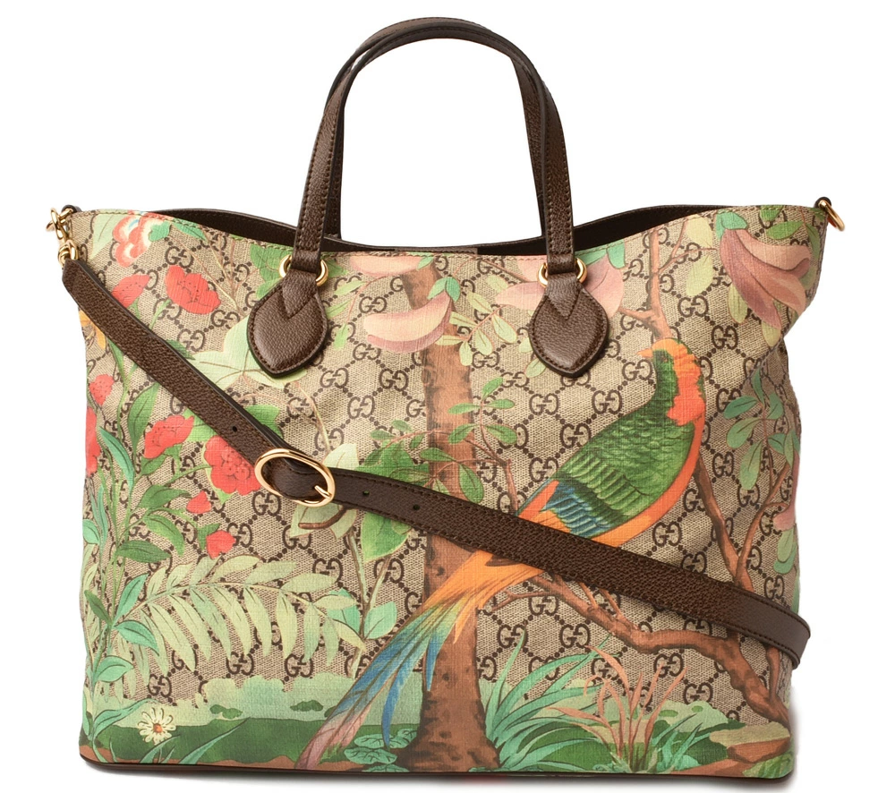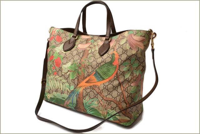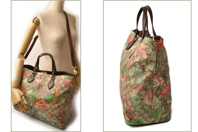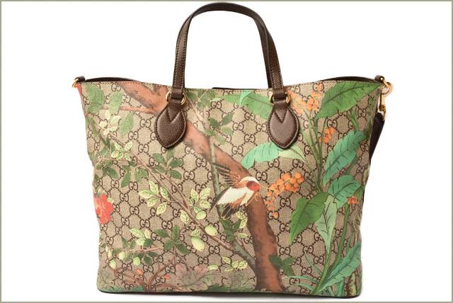 グッチより、A4サイズ/トートバッグです。GGパターンにティアン プリントを施した2wayバッグ。グッチの新たなティアン プリントは、18世紀のタペストリーやス屏風に描かれた中国の楽園のイメージにインスピレーションを得たコンテンポラリーなフラワーモチーフが特徴です。フラワー パターンには花とともに、トンボ、蝶、ハミングバードなどの昆虫や鳥たちが描かれています。軽やかなブラシストローク スタイルにより、動植物が立体的に描き出されています。