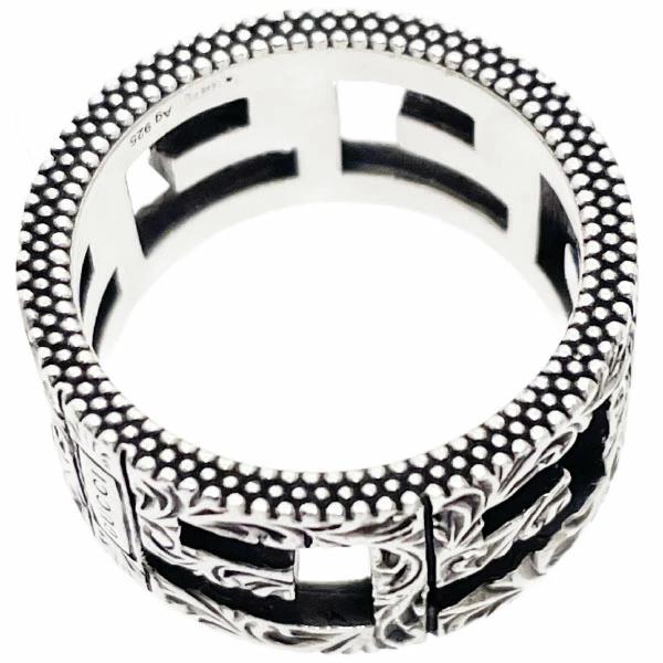 『GUCCI』から、燻し加工が施されたボリューム感のあるシルバーリングのご紹介です。アラベスク模様にスクエアGロゴがくり抜かれたカッコいいデザイン☆使う程にシルバーの味わいも増し、愛着も湧いてくる素敵なおすすめアイテムです★