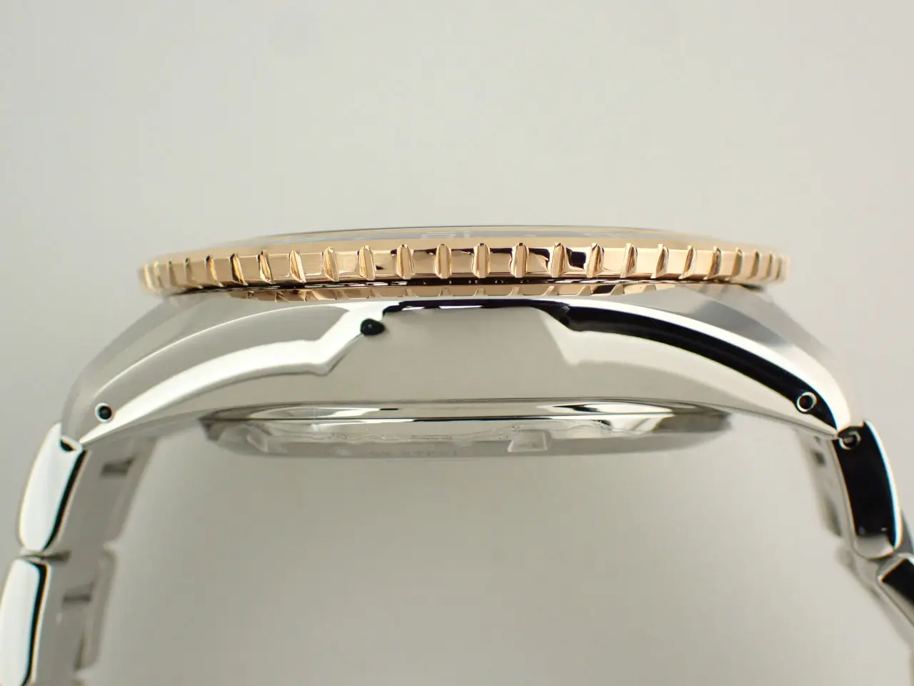 中古だが非常に綺麗な状態。時計本体やブレスのキズ等は光の角度により所々散見できる程度で、展示品・もしくは日常使用10回未満のような使用感がある状態。