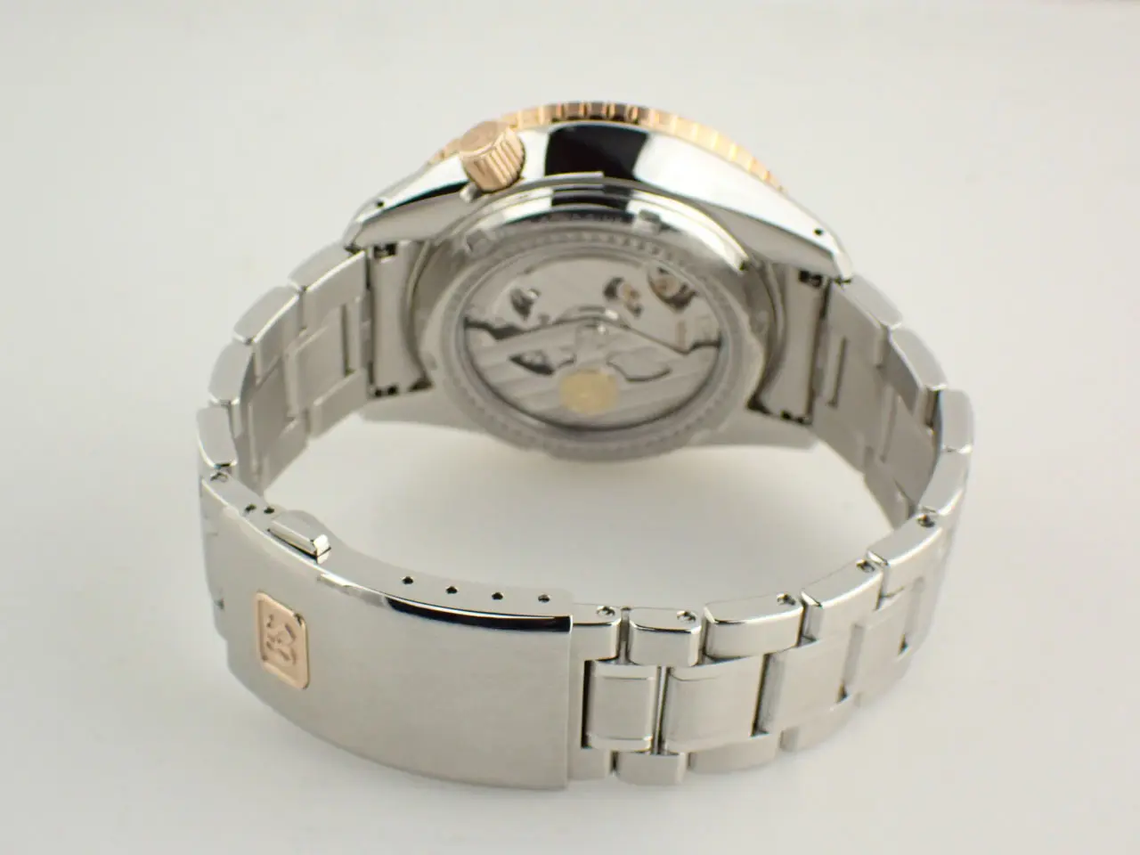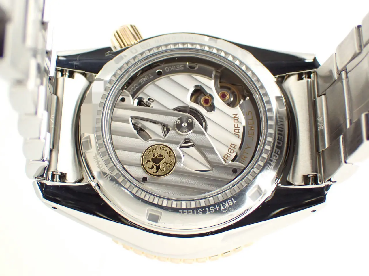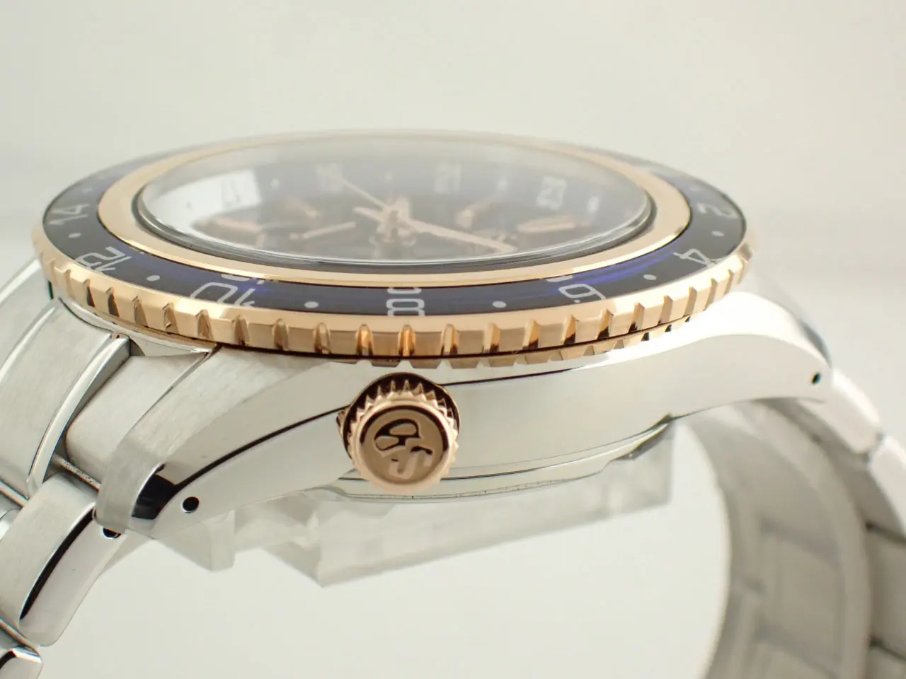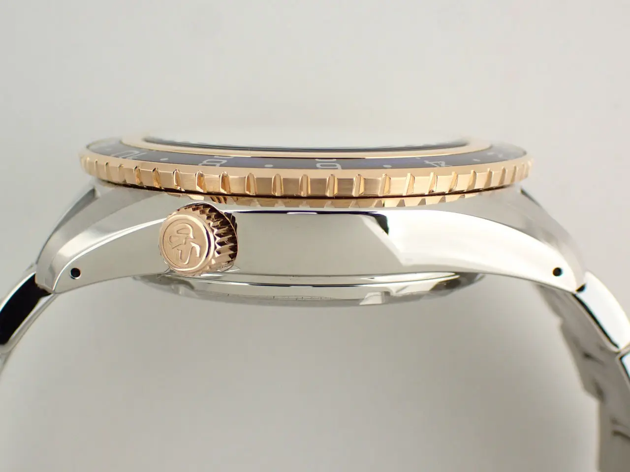 こちらの時計は、2022年のGS特選会にて70本限定で販売された、希少なモデルです。ブルーカラーダイヤルはサンレイ仕上げで上品に輝きます。時分針やロゴにあしらわれたピンクゴールドがエレガントですね。ベゼルには、硬度が高く加工するまでに高い技術を要するサファイアガラスを採用。縁取りの18金PGが華を添えます。ケースサイズの迫力の一方で、ラグは流麗な曲線を描きます。