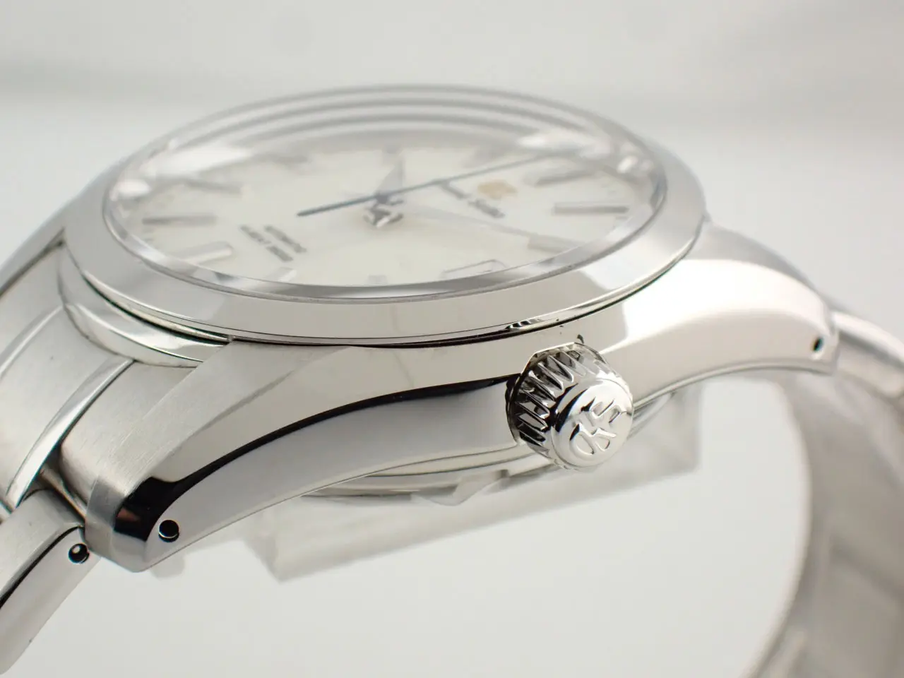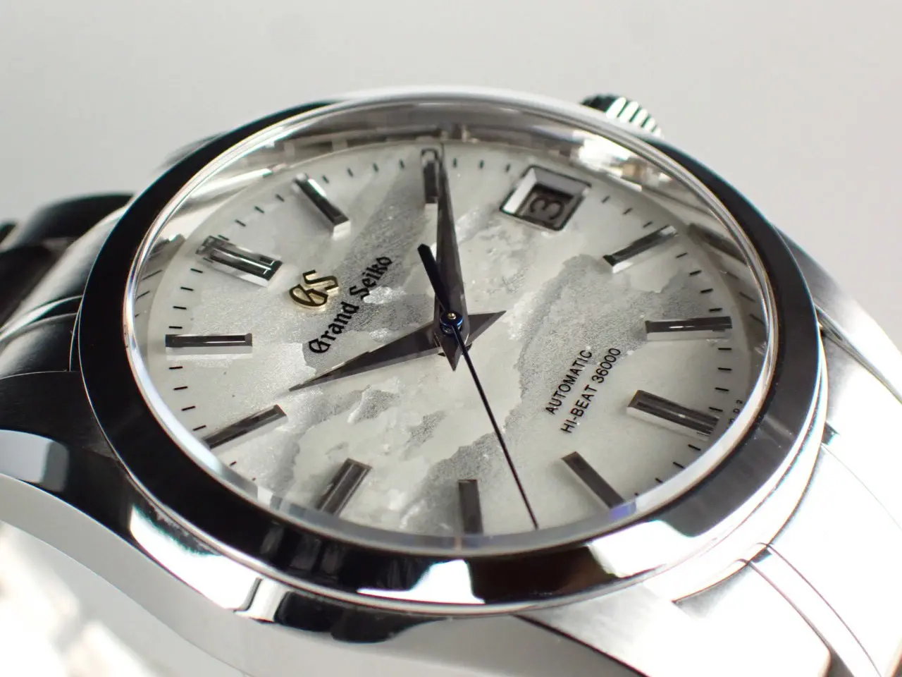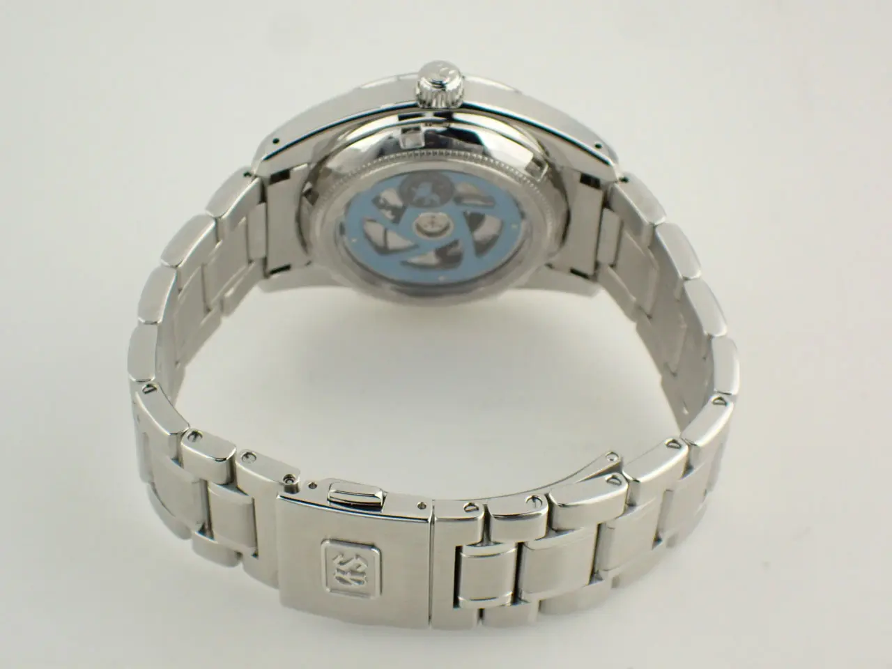 こちらの時計は、同社の9S系キャリバーの周年を祝した、数量限定モデルです。光の加減で変化する美しいシルバーダイヤルは、同社の時計工房から臨む岩手山の、「雲海」と呼ばれる自然現象をモチーフにしています。ケースデザインは、同社メカニカルのオリジン「SBGR001」と同じ物を採用。