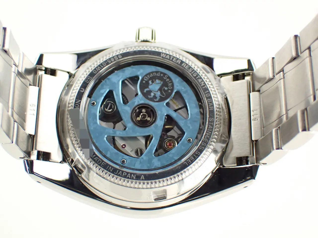 搭載ムーブメントは「9S85」。半導体製造に用いられる技術「MEMS(メムス)」により、ミクロ単位で部品を再設計。がんぎ車に中間車を挟んで、ハイビートのデメリットであるパーツの消耗を抑え、テンワの支柱を四本にすることで熱膨張による時刻のズレを防ぐ工夫がされています。また美しい回転錘は当モデルだけの特別仕様です。